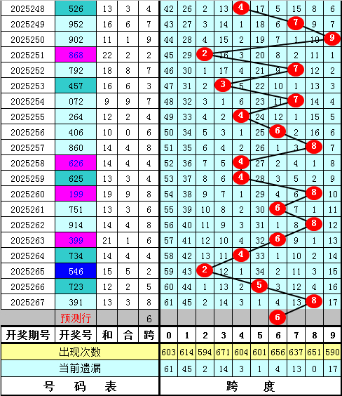 福彩3D第2025267期最大跨度开出8,近期最大跨度波动较大,本期预计最大跨度在4-8区段出现,最大跨度关注45678,精选跨度6。