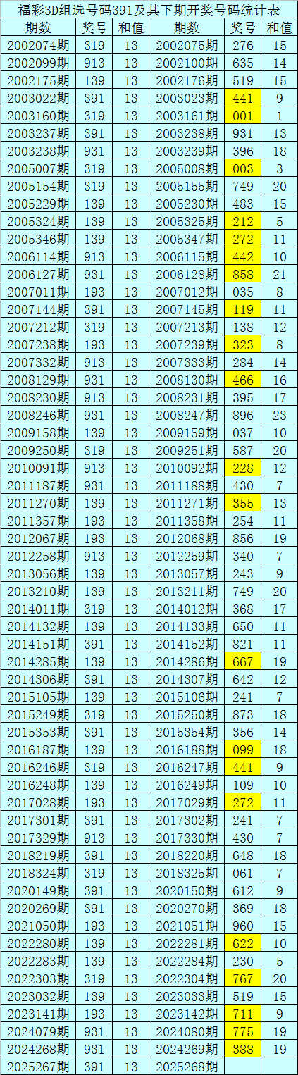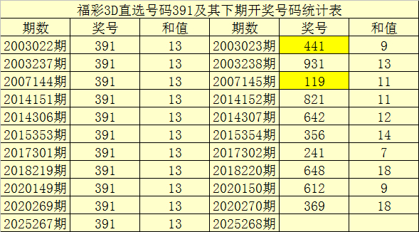 二、组选分析:历史上组选号码391开出了59次,其下期奖号分别为:276-635-519-441-001-931-396-003-749-483-212-272-442-858-035-119-138-323-284-466-395-896-037-587-228-430-355-254-856-340-243-749-368-650-821-667-642-241-873-356-099-441-109-272-241-430-648-061-612-369-960-622-230-767-519-711-775-388,其开出期数和下期奖号统计为: