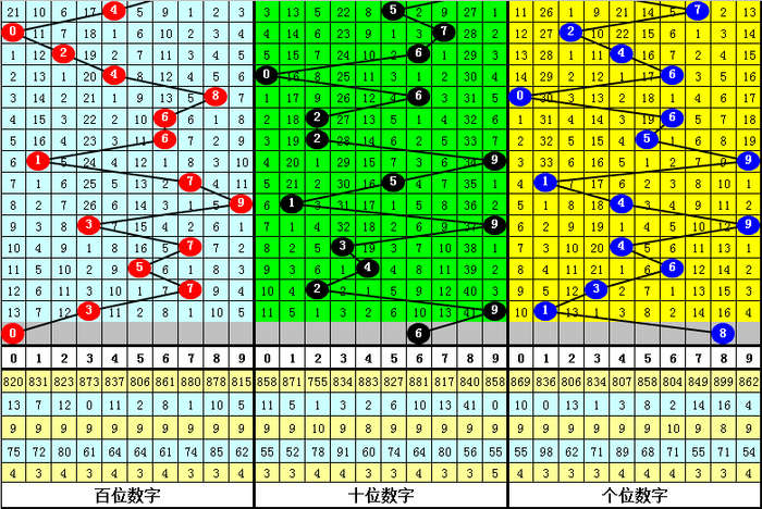 1、号码0-9出现开出频次分别为:号码2、3出现22次,号码4、6出现20次,号码1出现18次,号码0、8出现15次,号码5、7、9出现14次。一般来说,表现最冷的三码:5、7、9不会同时出现,本期杀一码:9;表现最热的四码:2、3、4、6中一般会出现奖号,本期注意号码;6。